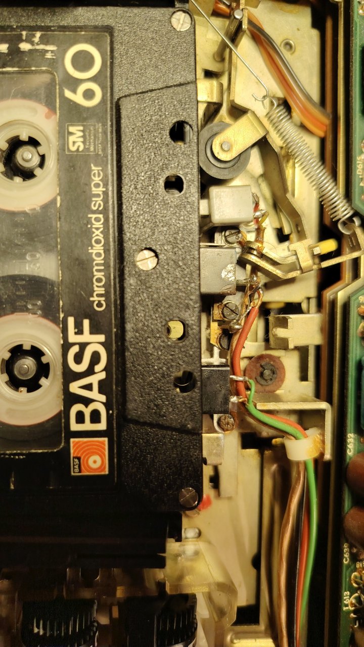 Im Stop-Zustand steckt die Tonkopfbrücke zu weit im Kassettenfach hinein. Muss die Brücke zu mir schieben so das die Kassette einrastet. Ejecthebel drücken schiebt die Brücke auch zurück. Play, FF und REW funktionieren, aber bei Pause spielt er irgendwie das Band doch ab. Was kann hier passiert sein? Ist das die Geschichte von der magnetisierten Klappe?