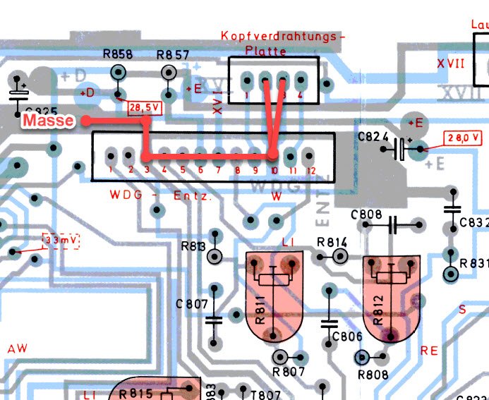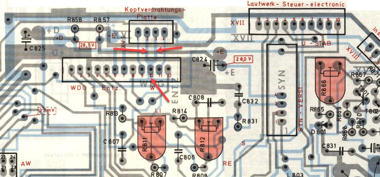 Daraufhin prüfte ich die Kopfverbindung des Wiedergabe Kopfes bis zur Wiedergabe/Entzerr Platine und musste Feststellen, dass dem Wiedergabe Kopf die Masse fehlt, die er oben an der Anschluss Platine genauso wenig hat, wie an der Chassis Platine am Steckanschluss XVI 3+4, gibt's keine Masse zur Chassis Platine.