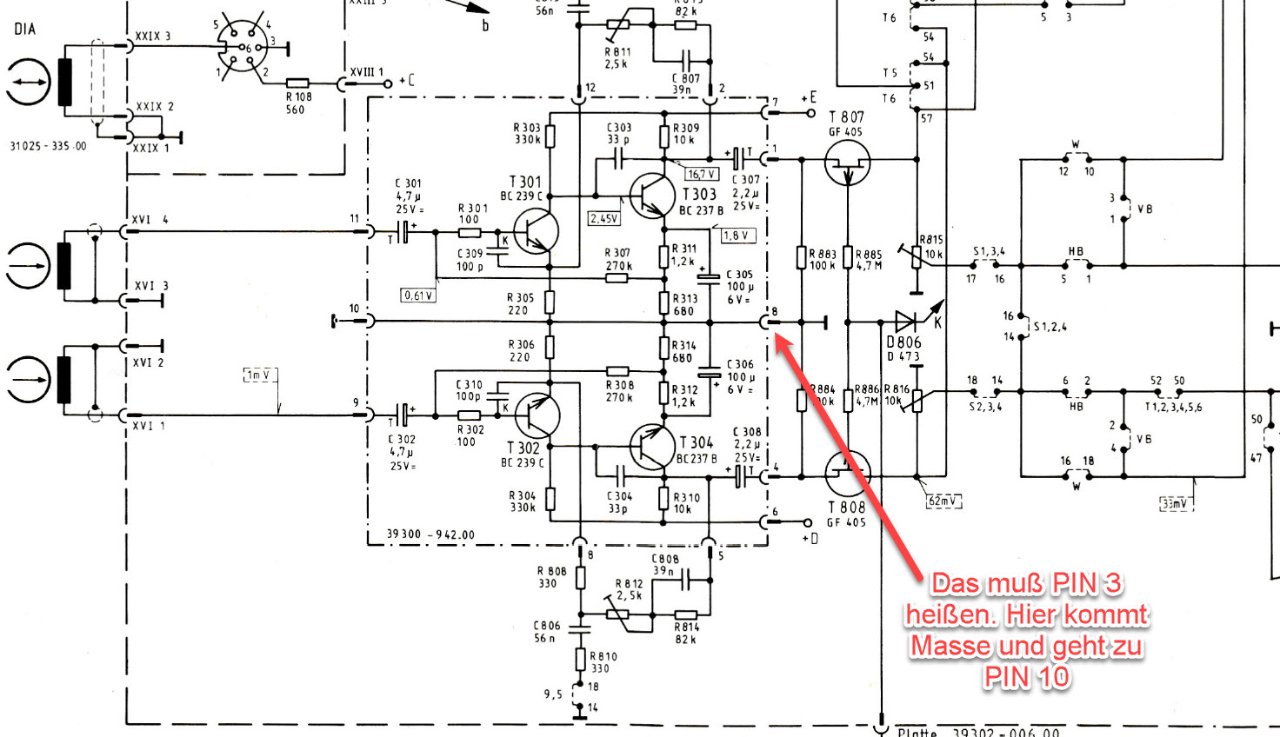 Wenn ich das richtig verfolgt habe, müßten die Wiedergabeköpfe, Masse über Pin10 des Wiedergabeverstärkers bekommen.