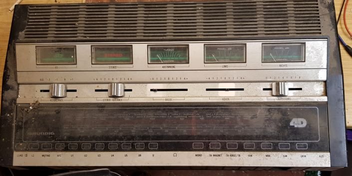 Viele zappelnde Zeiger, viele bunte Lämpchen, Knöpfe, die man schieben statt drehen musste, eine riesige Senderskala auf der man alle wichtigen Städte von Europa ablesen konnte, UKW-Senderspeicher zum Antatschen ohne Ende und einen Abstimmknopf, den man zur besseren Griffigkeit raus ziehen konnte. Ein Feature von dem ich mir nicht sicher bin, ob je ein Besitzer davon Gebrauch gemacht hat.