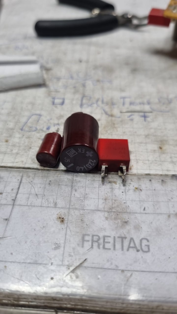 Hatte ja alle Platinen draußen und gekurt , bis auf eine , und da war doch noch einer der berühmten Gleichrichter und der war durch. Hab dann gleich die Elkos mit gemacht und alles nach gelötet. Jetzt Läuft sie und ich kann mit dem zusammenbauen anfangen.