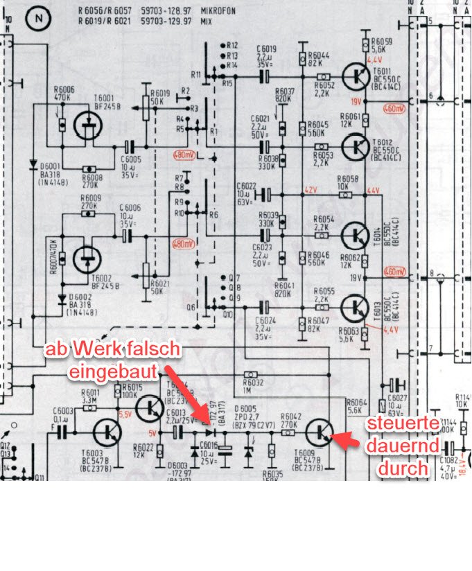 Es folgte eine ziemlich aufwändige Meßorgie. T6009 der Mischeinrichtung steuerte ständig durch und schaltete so das Muting dauerhaft ein. Grund war eine ab Werk falsch eingelötete Diode – D 6004. Kaum umgedreht, stimmte auch der Pegel bei den normalen Programmquellen wieder. Mit eingestecktem Mikro wurde die Funktion der Mischeinrichtung überprüft.