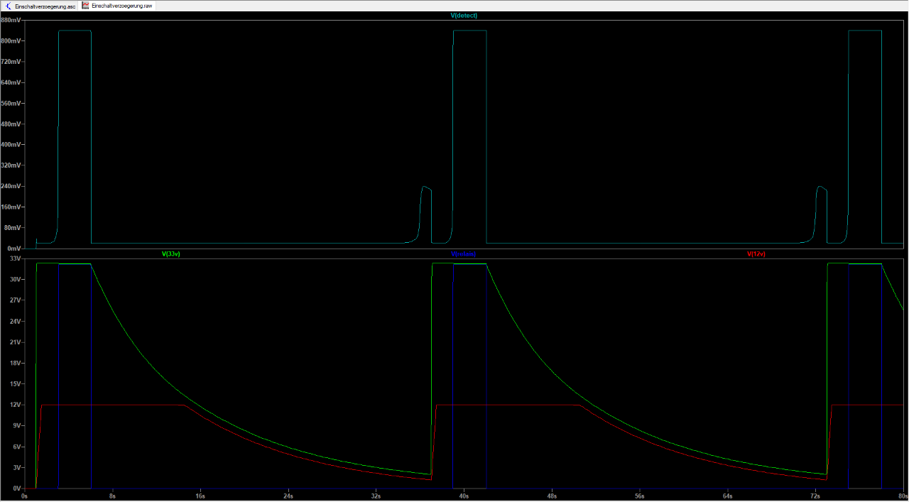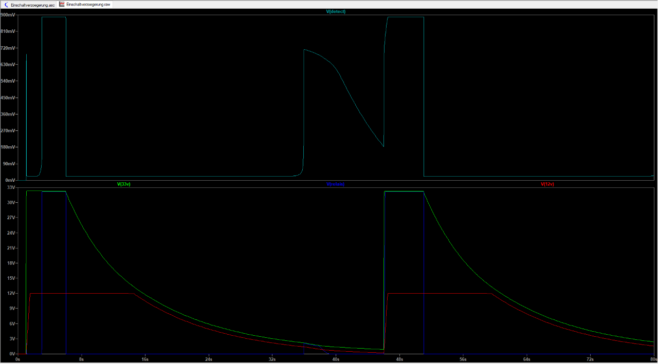 Das andere ist, dass am Punkt Detekt nach ca. 40s vorübergehend ca. 0.7V anliegen, weil die 12V Versorgung da gerade auf einer Spannung ist, bei der sie diesen Punkt nicht mehr auf Masse ziehen kann, aber der 1MOhm Pullup ja immer noch da ist. Der Glitch kommt dann auch noch oben drauf. Das Relais zieht sofort an.