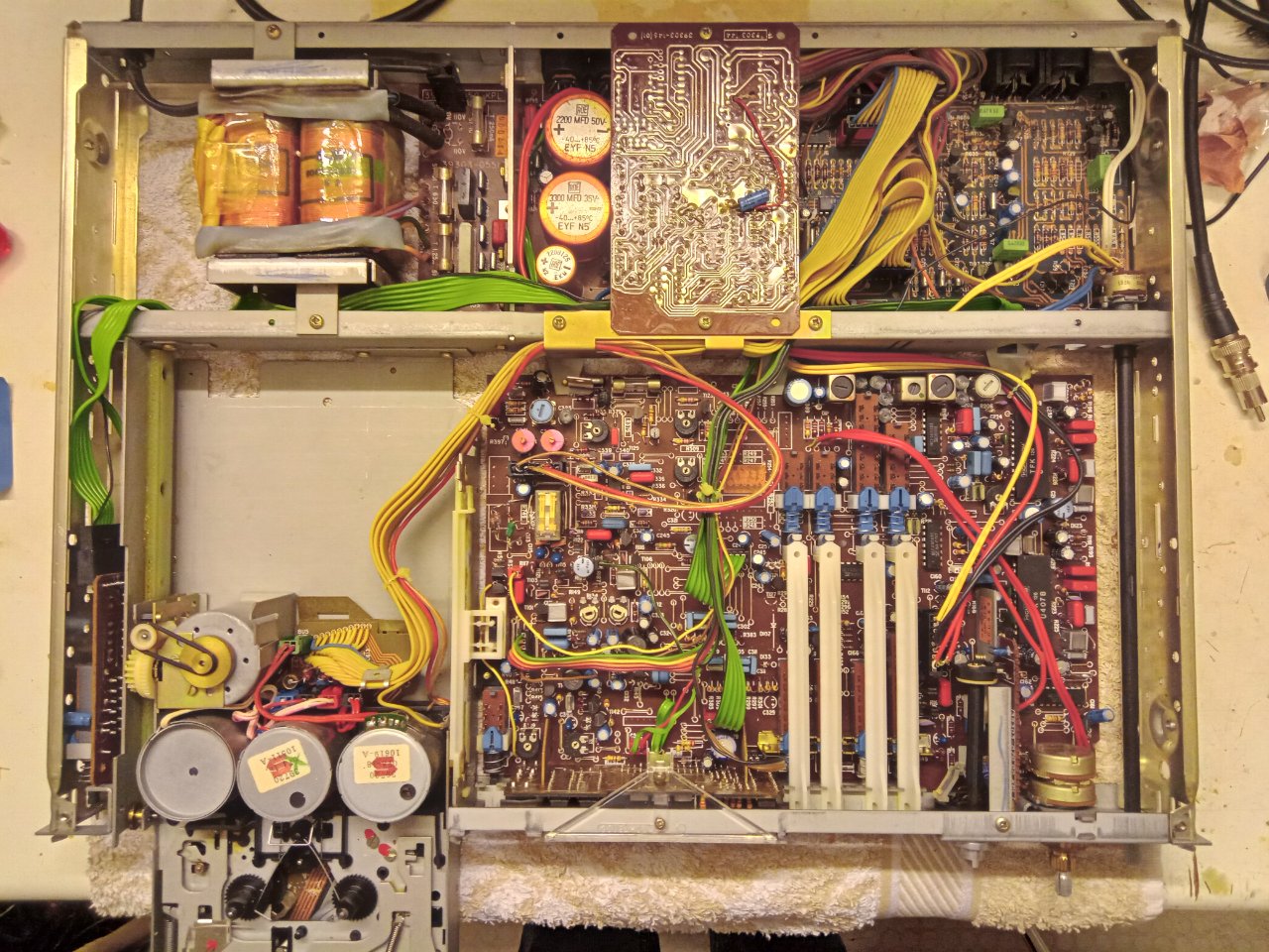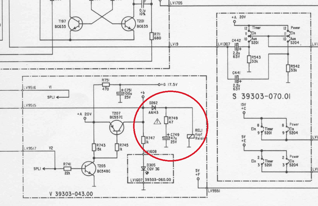 Weitere Findings: Die Elko sind schon ein wenig aufgebläht, obwohl die im dicken Alu-Becher stecken. Da wird es demnächst wohl eine Explosion geben. Weiß jemand, warum das Relais keine Freilaufdiode hat und warum man dieses über eine Germaniumdiode schaltet? Das hat auch schon ein Fernsehtechniker in den 80ern herumgebastelt.
