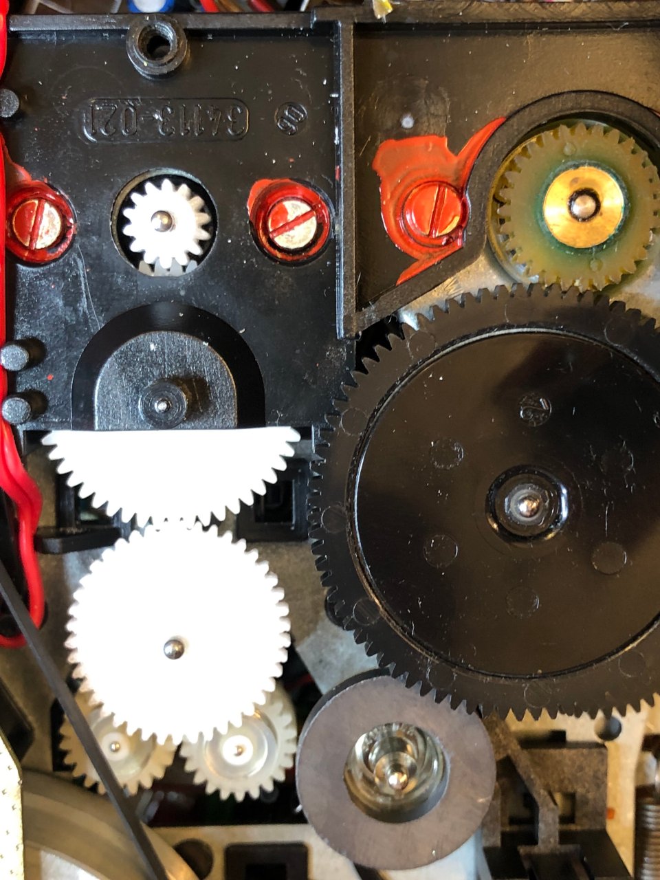 Auf dem Foto sieht man das neue TPU-Motorritzel sowie das TPU-Doppelzahnrad. Das halb verdeckte Zwischen-Zahnrad und die kleinen Wickeldornantriebszahnräder auf dem Schwenkhebel sind noch original, ebenso das Motorritzel für den Kopfschlittenantrieb. Zu Testzwecken hatte ich die Wickeldorn-ZR auch gegen TPU-Varianten getauscht, das brachte aber keine weitere Reduktion der Umspulgeräusche. Daher habe ich es dort bei den Originalen belassen.