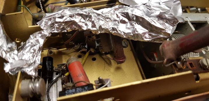Die meiste Aufmerksamkeit forderte das Wechseln der Kondensatoren unterhalb der Seile, die die AM-Bandbreitenreglung steuern. Hier hatte ich die Idee, die Seile mit Alufolie vor dem Lötkolben zu schützen. Das hat gut geklappt - wenig Aufwand und gute Wirkung. Bild