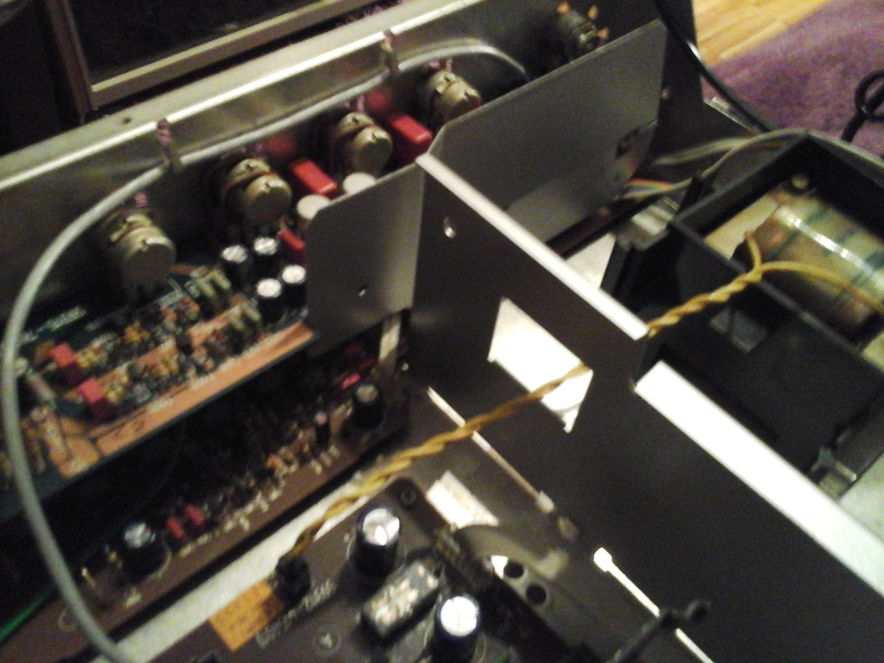 Elkos, alle richtig gepolt, funktionierte doch schon, aber: Was hängt der ein Widerstand auf Stelzen so schräg. War es das? Eingeschaltet, weg. In der Nähe angefasst, ja Brummen beim Tuner. Das war es. Beim Ausbau wohl unachtsam abgelegt.