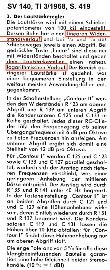 Oder man verwendet einen hochwertigen kleinen Stufenschalter (> 24 Stufen) und bildet ein lineares Poti nach und beschaltet die Schaltstufen die annähernd 1/3 und 2/3 des Widerstandes entsprechen mit den bisherigen Loudness-Komponenten und sollte wieder bei einer näherungsweisen logarithmische Charakteristik mit Loudness landen, wenn natürlich ausreichend Platz im V/XV/SXV 5000/6000 vorhanden ist, für solche Umbauten.