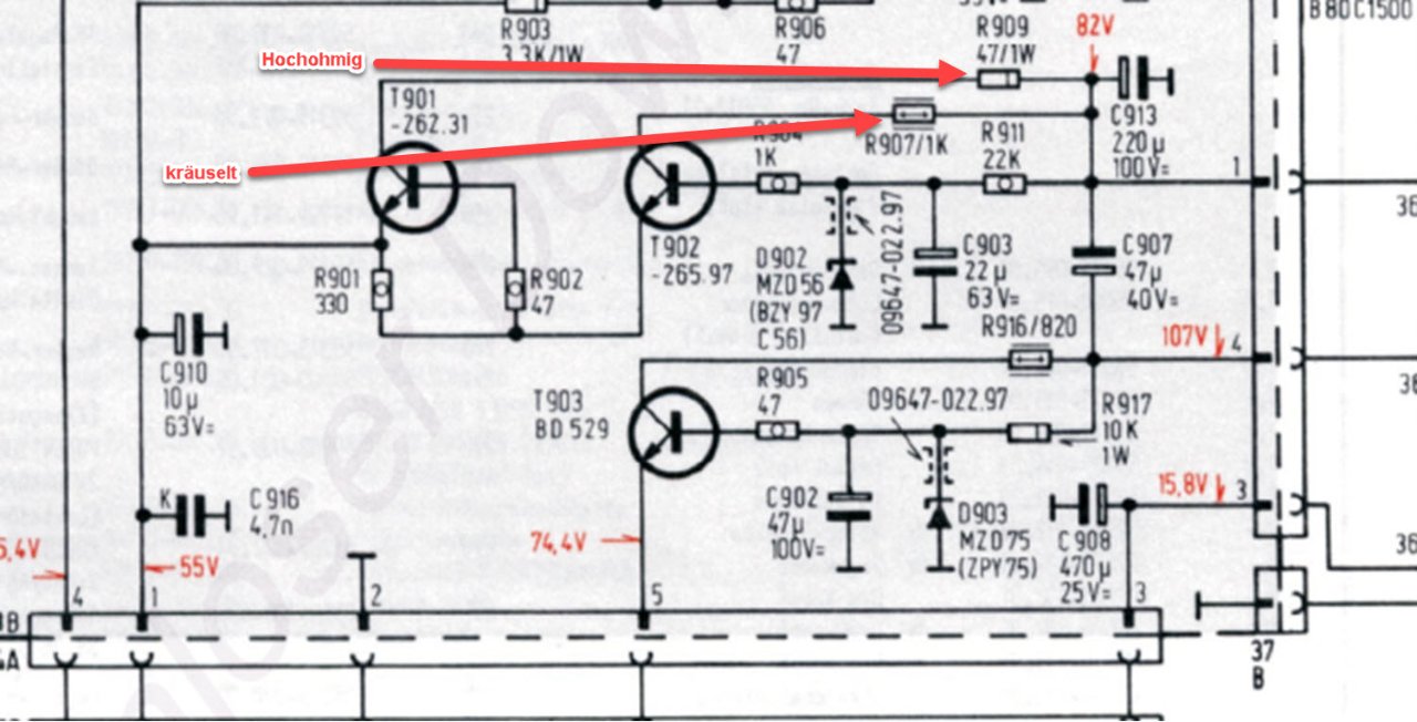 Der Ausfall des R909 im Netzteil / 55V Schiene hat den TCA 530 für die Abstimmspg. mit in den Tod gerissen. Ein halb ausgeschlachteter MT 100 diente als Oganspender.