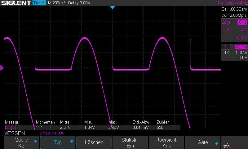 Nachdem also nun bei offenem LS-Relais die 4 Ohm last nicht mehr am linken Kanal hing, fiel mir auf, dass unmittelbar bevor das Sinus-Signal im linken Kanal zusammenbricht, ein hochfrequentes Schwingen auf dem Sinus als "Raupe" auf dem Sinus erkennbar wurde: