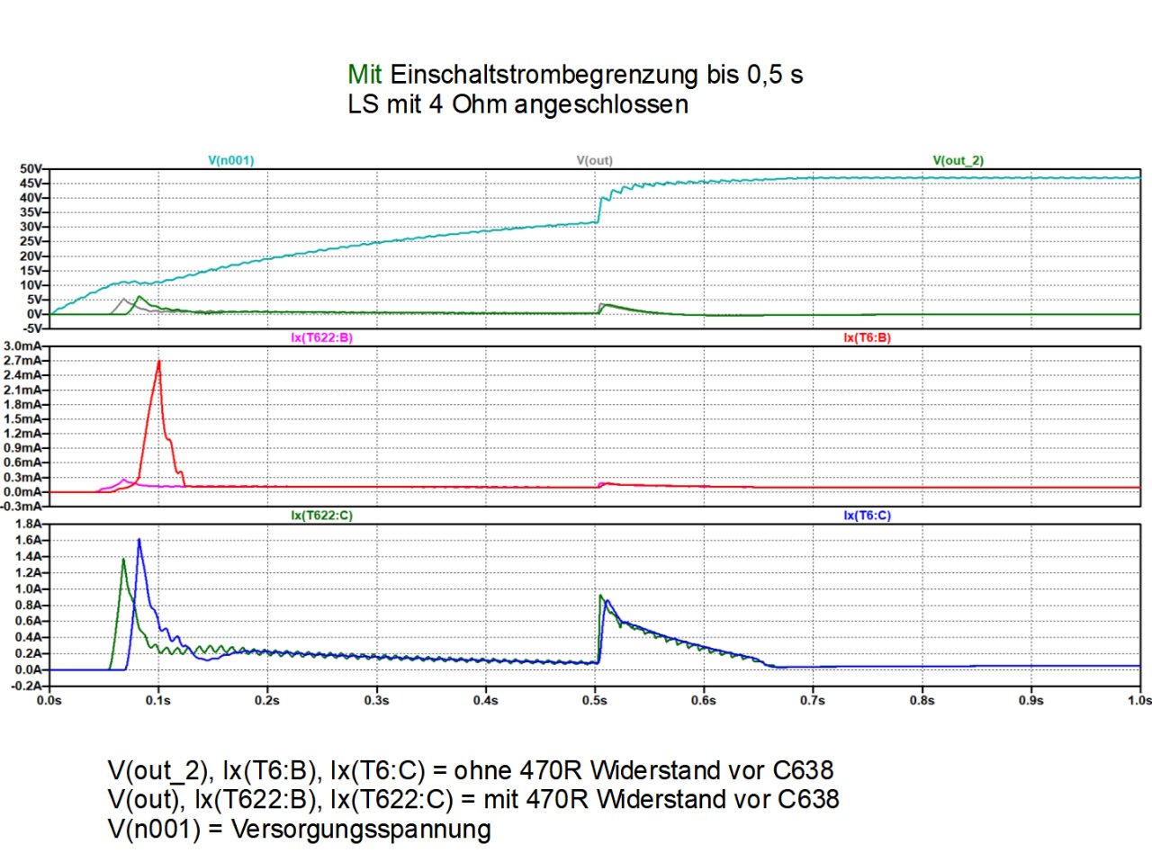 Der Basisstrompuls von T622 ist durch die Einschaltstrombegrenzung auf ca. 1/3 vermindert. Das gilt auch für den Puls bei eingefügtem Vorwiderstand vor C638 (C738). Dabei erreicht die Basisspannung an T622 bei ca. 0,1 s aufgrund der noch im Hochlauf begriffenen Versorgungsspannung zu diesem Zeitpunkt, 10 V, hoffentlich genügt das - mehr wäre hier besser. Ein Kompromiss aufgrund ebenfalls gewünschter kleiner Strompeaks. Verkleinerung des Raumtemperaturwiderstands des NTC vergrössert die Basisspannung im Einschaltzeitpunkt aber vergrössert auch den Basis- und den Kollektorstrompuls. Ggf. also ein NTC mit 10 Ohm (für ca. 13-14 V) oder 5 Ohm (für ca. 17-18 V Basisspannung) nehmen und dafür den Nachteil höherer Strompeaks akzeptieren.