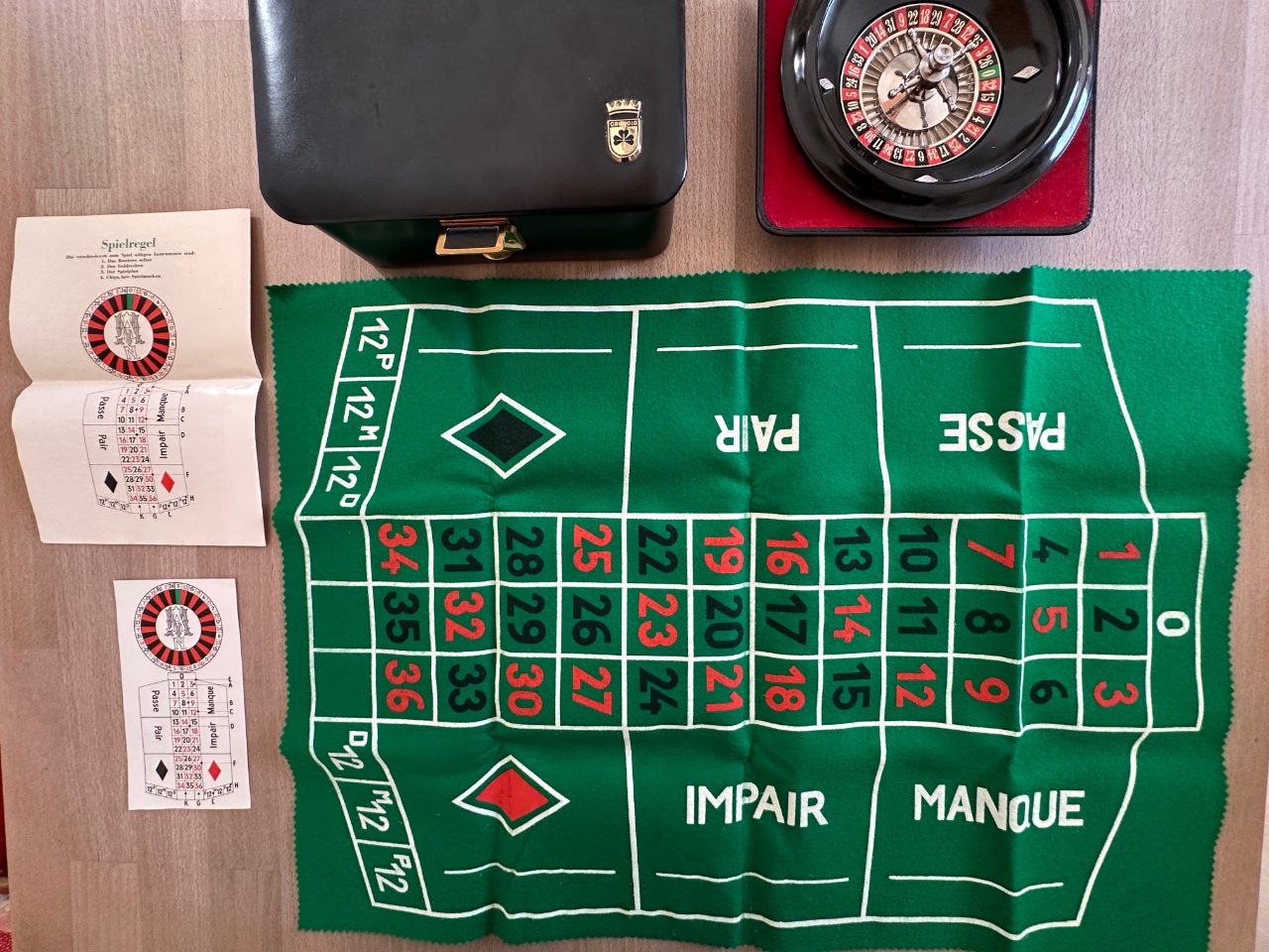 Ich habe ein Grundig Roulettespiel aus den ca. 50er Jahren, Es ist in Leder bezogen und hat Messingbeschläge, es ist ein 15x15cm kleiner Koffer mit altem, Goldenen Grundig Logo (Wappen plus Krone) und ist vollständig mit allen Chips und Stählernem Geldrechen. Das Roulette selbst ist ebenso voll aus Metall. Ich möchte mehr zu dem Stück herausfinden da mir niemand weiterhelfen kann... Könnt Ihr mir mehr Informationen dazu geben ?