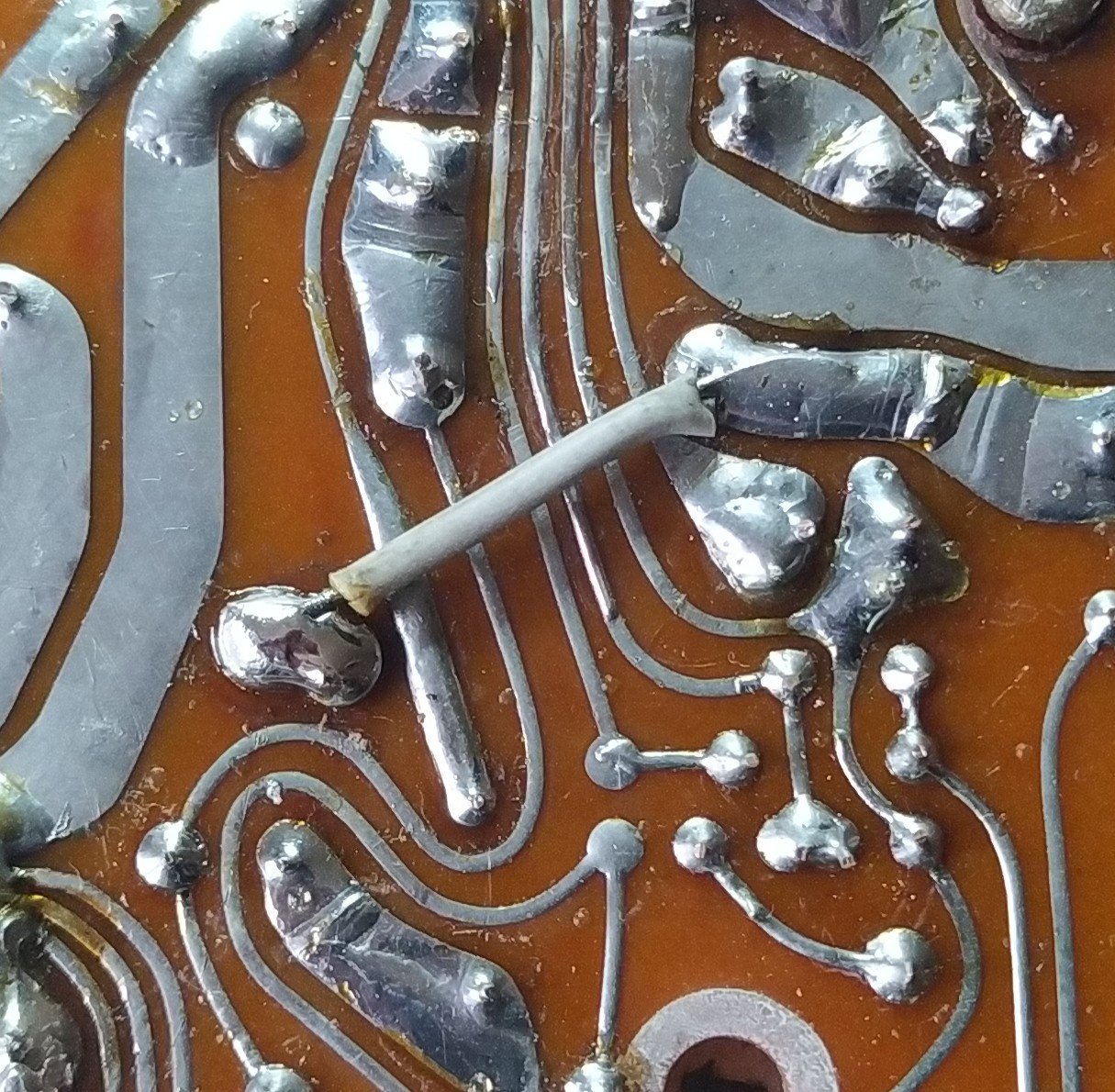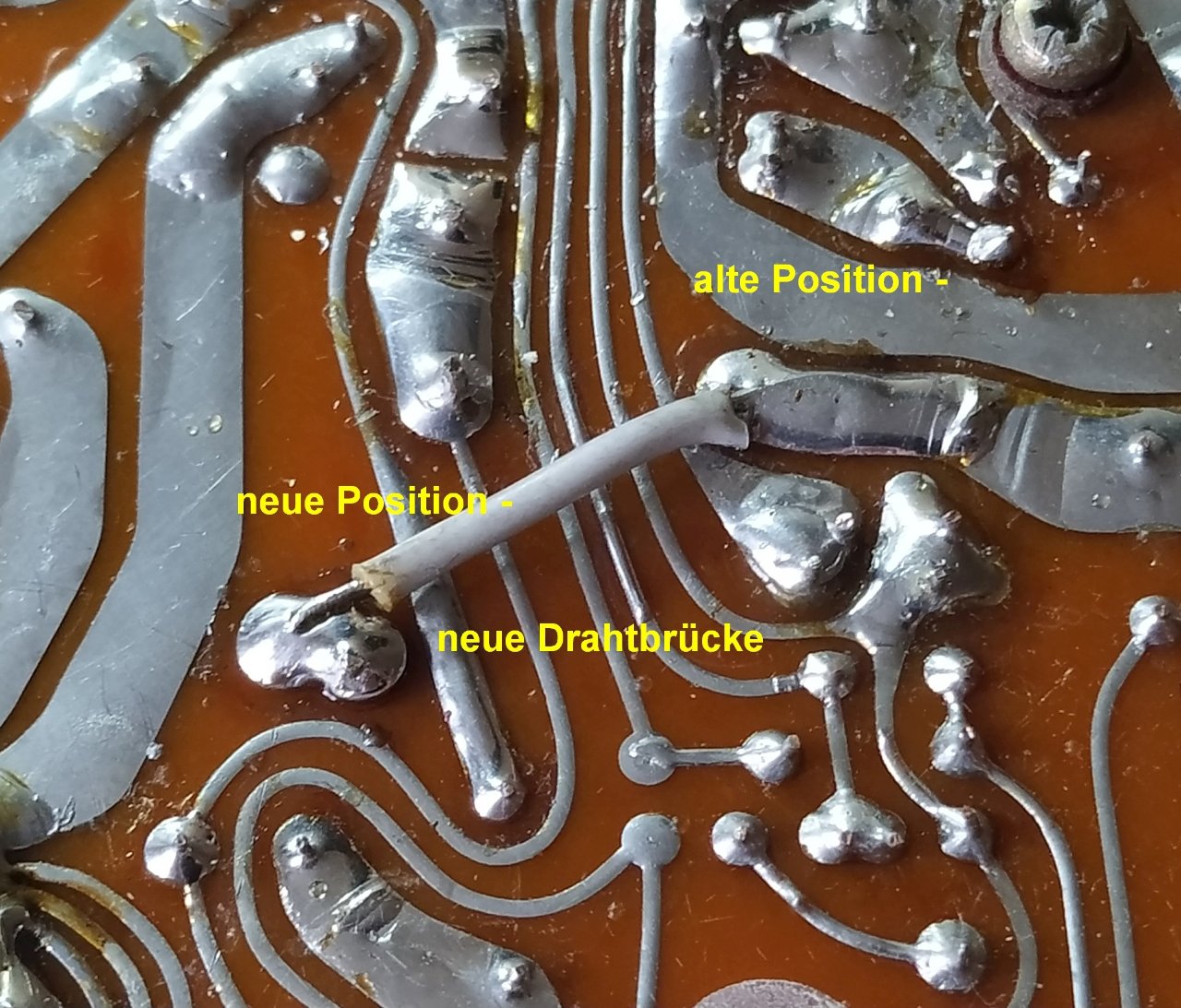 Ein Ende der neuen Drahtbrücke ist nicht vom Lot umschlossen, sondern nur berührt. Besser vollständig verlöten, ich meine, dass das Drahtende ganz umschlossen ist.