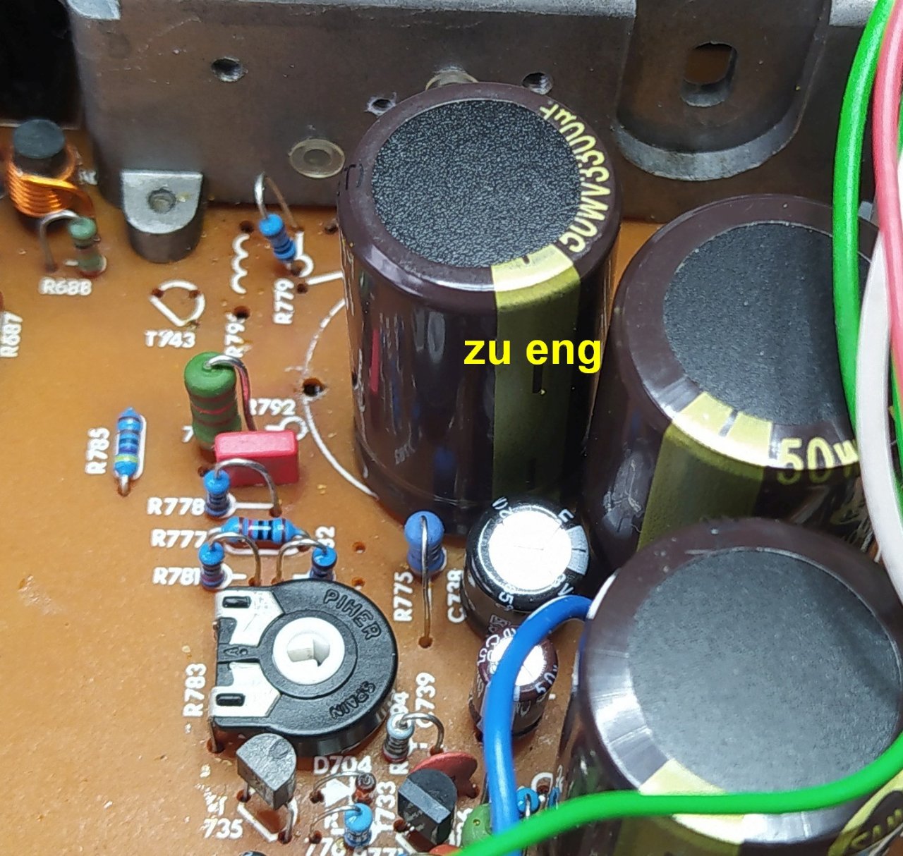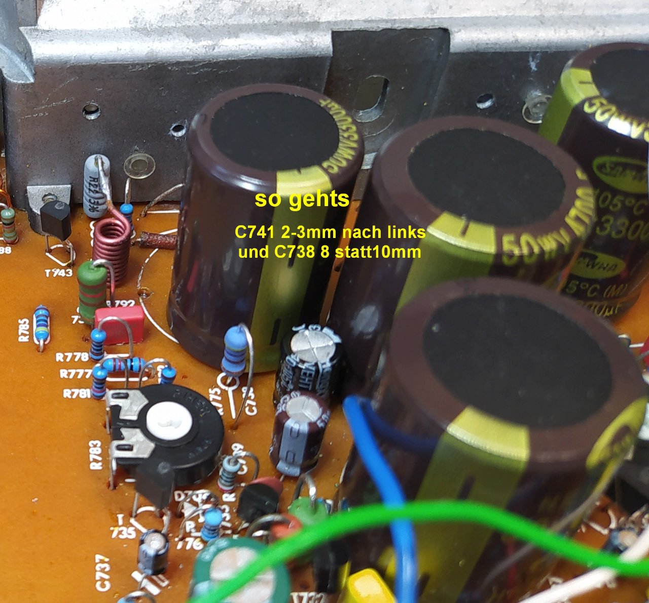Der 0,22 Ohm Widerstand an R795 darf den Kühlkörper nirgendwo berühren. Etwas vom Kühlkörper wegbiegen. Wenigstens ein Blatt Papier muss sich noch mühelos dazwischen schieben lassen können.