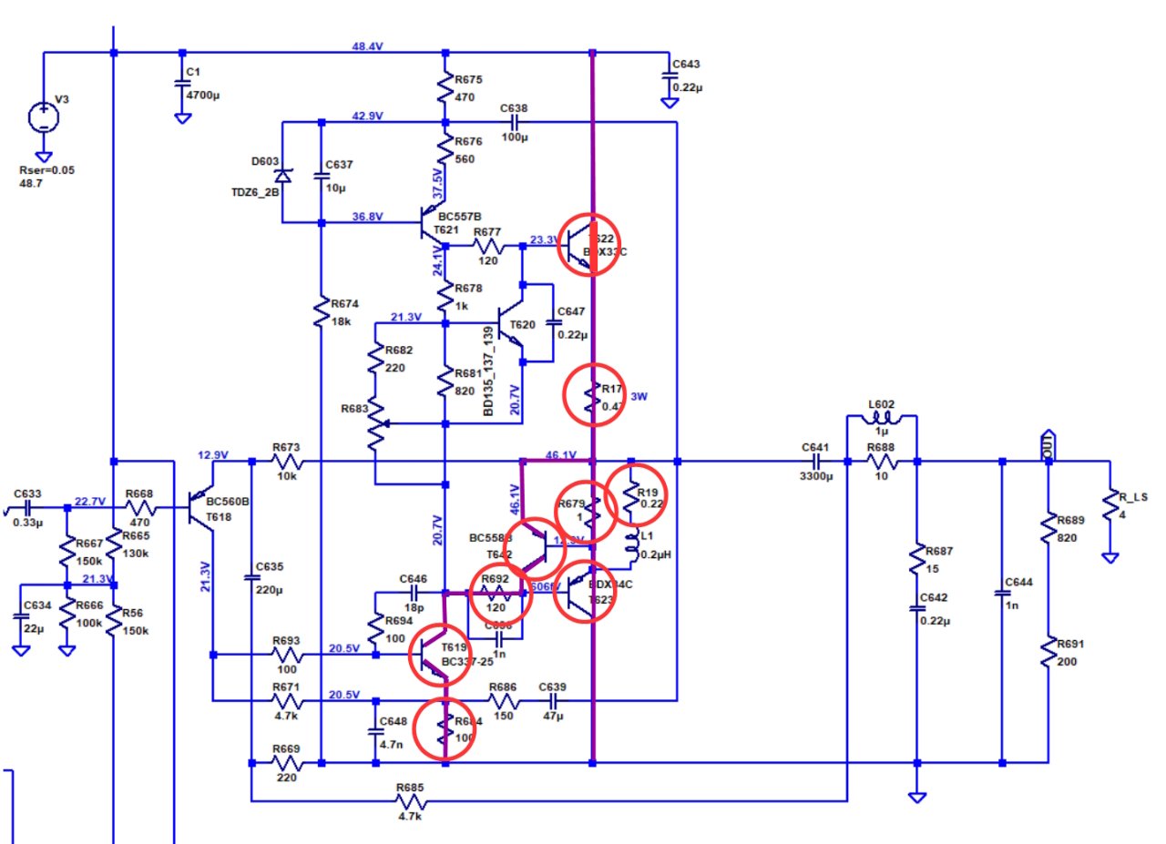 Mal angenommen, T622 fällt zunächst mit durchlegierter CE-Strecke aus. Dann fliessen darüber 5 A. In Folge sind (wenigstens) alle rot umkreisten Bauteile betroffen bzw. dadurch defekt: