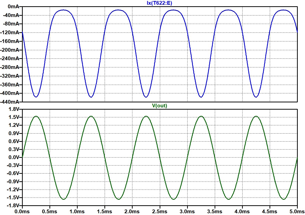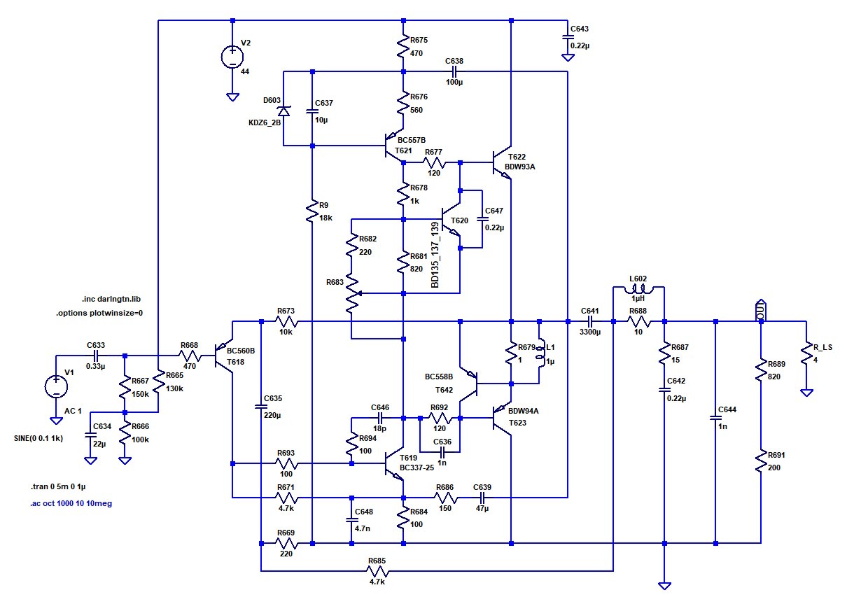 Ist die Verbindung der Versorgungsspannung (+44 V) an/über R665 korrekt hergestellt, arbeitet die Endstufe in der Simulation fehlerfrei: