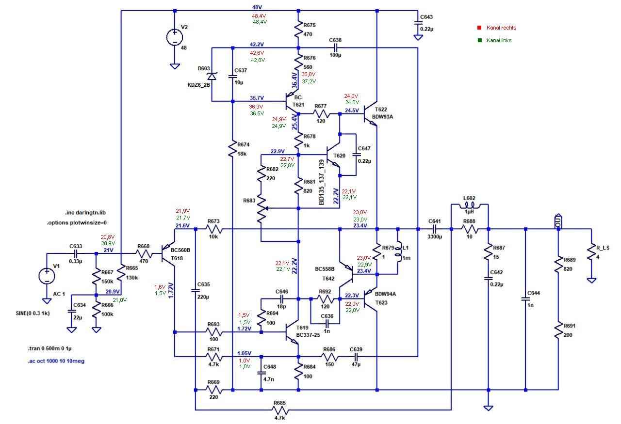 Ich habe alle Spannungsangaben aus der Simulation an meinem MR nachgemessen, leider alles unauffällig. Es ist aber interessant, daß alle Spannungen stimmen, obwohl meine Ruhestrompotis komplett zugedreht sind und der Ruhestrom deutlich unter 50mA sein müßte.