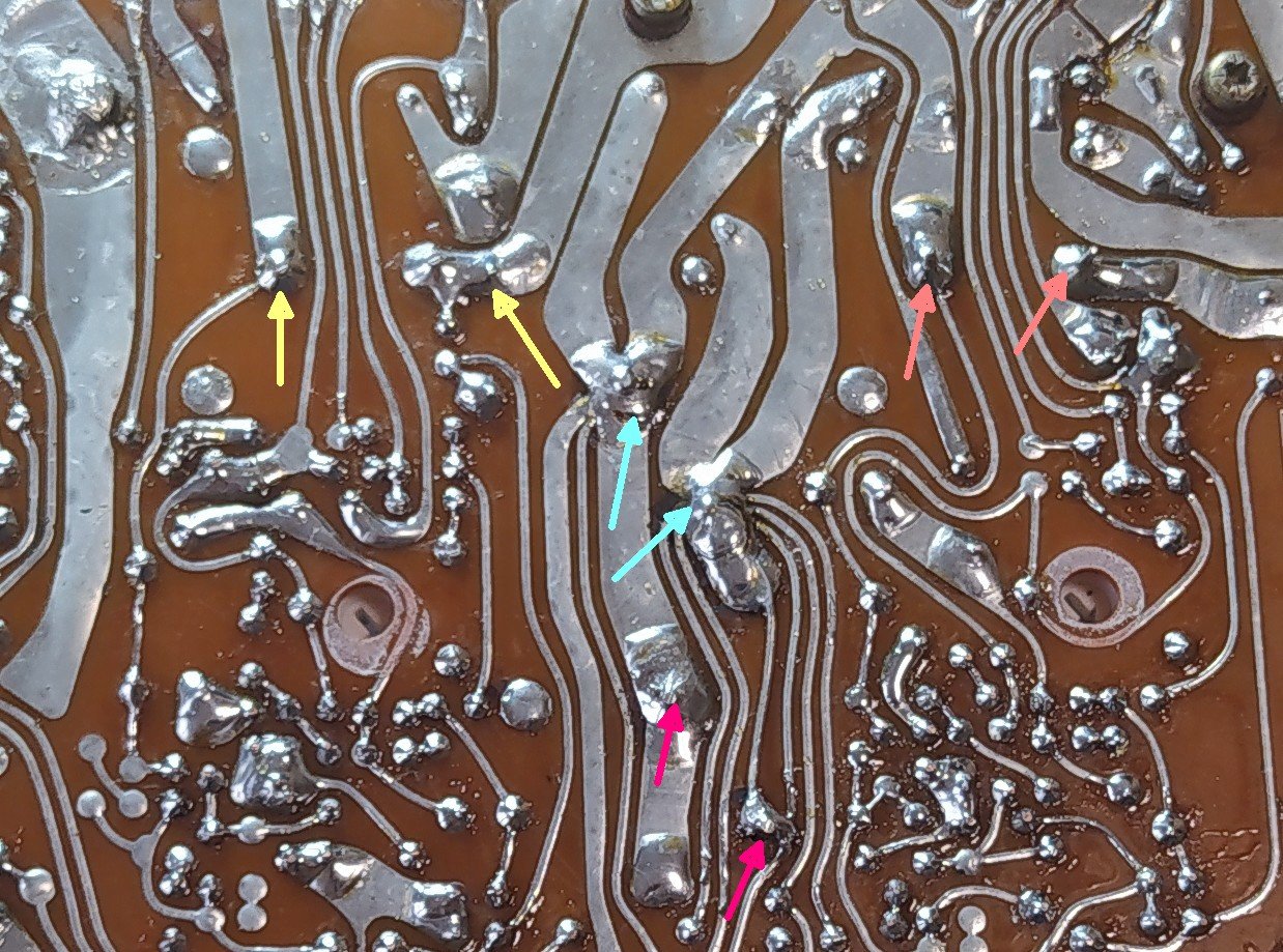 Ah, Du hast den Minuspol des einen 4700uF Elkos an einen der nicht verbundenen Lötstützpunkte gelegt und von da eine Drahtbrücke zur Masse gezogen. Auf den Bildern sah es erst so aus, als wenn da aus dem Nichts eine neue Leiterbahn auftaucht. Das erklärt dann auch die unlogische Positionierung der beiden großen Elkos zueinander.