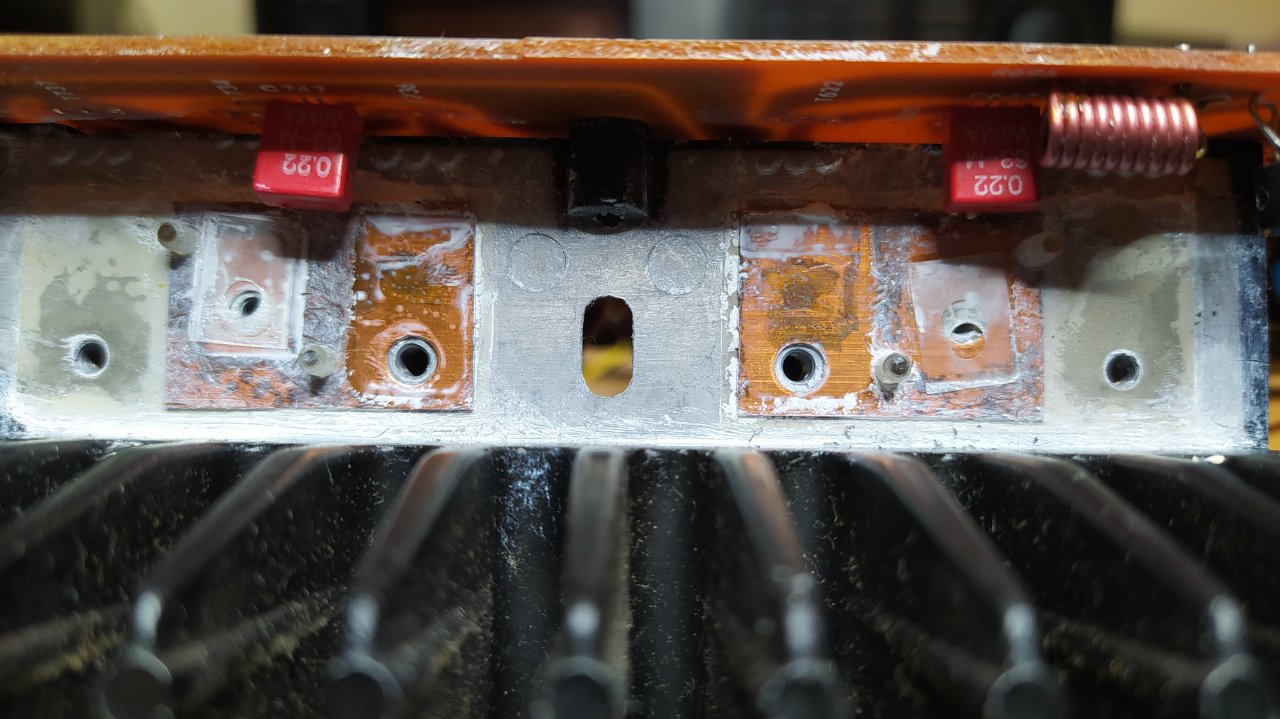 Es geht mir dabei nur um die eigentliche Isolierung der einzelnen Transistoren zueinander und gegen Masse, nicht dass von vornherein ein kapitaler Kurzschluss eingebaut ist. Da ist erst mal eine Glimmerscheibe über alle 3 Transistoren, darauf ein Kupferblech und darauf, für den BD135, nochmal eine Glimmerscheibe. Wenn ich dann denn mittleren Pin der BDW93 gegen Masse prüfe, piept es ganz kurz, was es ja meines Erachtens nicht tun sollte.