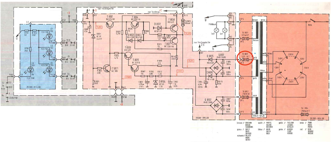 Eine Messung ergibt, dass die Sicherung Si 802 1,25 Ampére Träge (rot markiert in Abbildung 1) defekt ist, die ich leider nicht da habe und bestellen muss. Dadurch fehlt auch wie vermutet die Stromversorgung +D (5,1 Volt) für die Bandsortenanzeige (LEDs) und die Logiksteuerung.