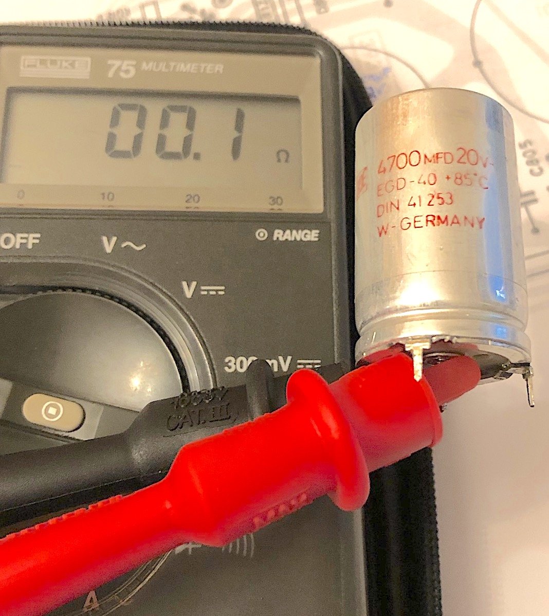 Messung zeigt dann auch einen vollständigen Kurzschluss dieses Elkos, was ich bisher auch noch nicht hatte. Eine Messung der weiteren Komponenten ergibt keine weiteren verdächtigen Bauteile. Die Transistoren scheinen ok zu sein. Ich beschließe die anderen Elkos ebenfalls auszutauschen auch wenn diese bisher ok aussehen.