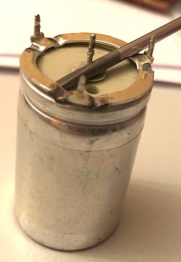 Die zwei großen alten Elkos haben vier Anschlussbeine, dreimal Masse am Ring und + in der Mitte. An den Elkos sind Kontaktringe angepunktet, die man sehr leicht mit einem Schraubendreher abhebeln kann. An diese nun losen Ringe löte ich dann den Massekontakt der neuen Elkos an, so dass der +-Pol durch die Mitte des Ringes geht, da die neuen Elkos einiges kleiner sind als die Originalen. Verwendet habe ich Panasonic FC mit 105°C,
