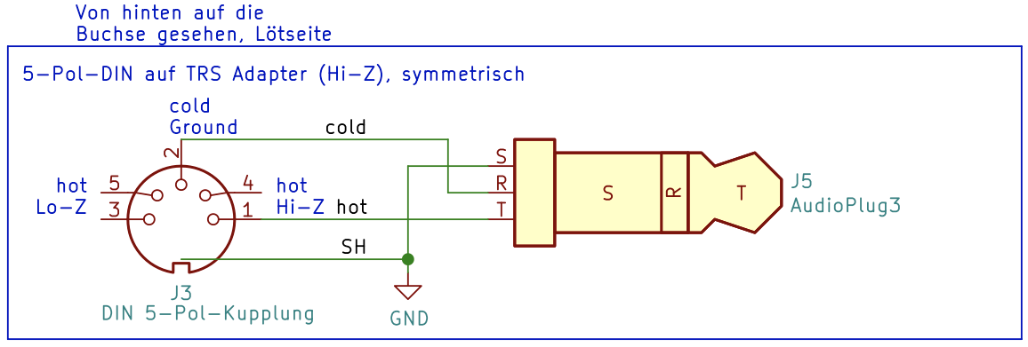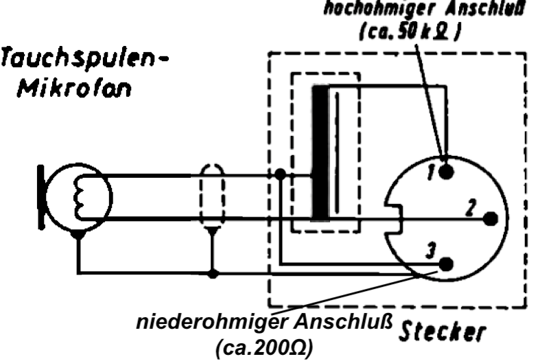 Wie man sieht, liegt an PIN 1 des DIN-Steckers der hochohmige Ausgang vom Übertrager und an PIN 3 direkt die niederohmige dynamische Kapsel.