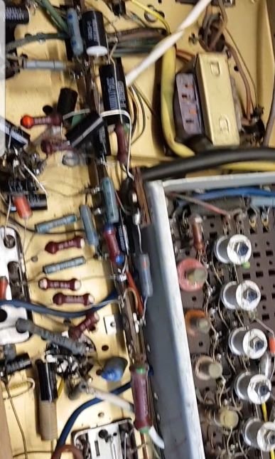 In anderen Foren habe ich gelesen, dass es Menschen gibt, die die Chassis in die Spülmaschine packen und danach stundenlang im Backofen bei 60 Grad Umluft trocknen. Gut, das ich darüber nicht weiter nachdenken muss. Das Chassis ist so groß, dass es nicht in den Ofen passt. Aber ich find es schon spannend was es alles gibt. Mein Chassis ist verstaubt, etwas matt aber nicht verdeckt. Mal sehen, was ich noch machen werde. Auspusten, Skala reinigen, Potis entharzen, Skalenseil-Umlenkungen leichtgängig machen und dann überlegen …. Ich denke: Patina nach 67 Jahren ist auch nicht schlecht.