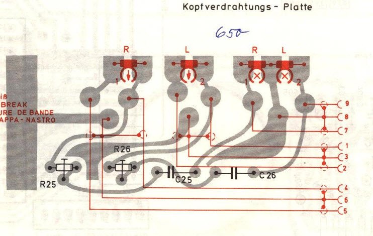 Ganz einheitlich ist die Schaltsymbol Zuordnung zu den Leiterzügen auf der Kopf Anschluss Platine leider nicht, der der Bandriss Schalter ist der einzige mit nem Massesymbol und der Schalter funktioniert auch. Dass heißt dann für mich, dass die Massezuführung für den Widergabe Kopf, unten auch der Chassis Platine an den mittleren beiden Stiften der 4 Stift Buchse neben den Steckerstiften für die Wiedergabe/Entzerr Platine erfolgt, hier aber gibt's nen zwei lagigen Leiterzug, der es sein könnte, wohl aber nicht kontaktiert. Habe deshalb von der Lötseite eine Brücke zur Masse gelötet, hat bislang aber nichts gebracht, Vermute aber nen defekt auf dieser W/E- Platine, die wohl baugleich mit der Aufnahme Platine ist....kann es so sein ?