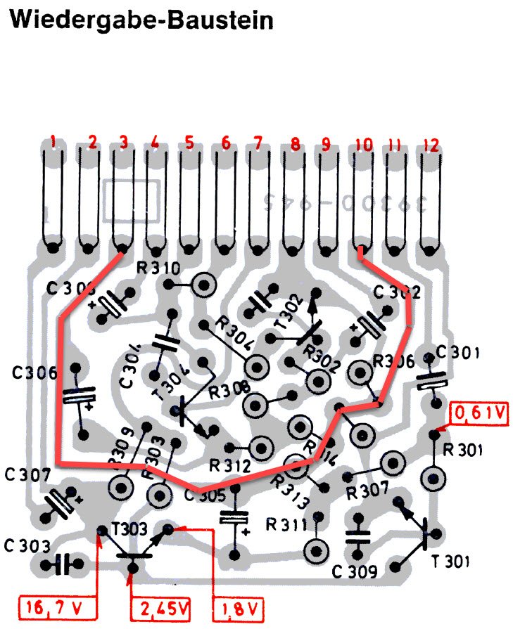 Masse von Grundplatine -----> Pin3------>Wiedergabeverstärker------>Pin10 Wiedergabeverstärker------->zu den Wiedergabeköpfen.