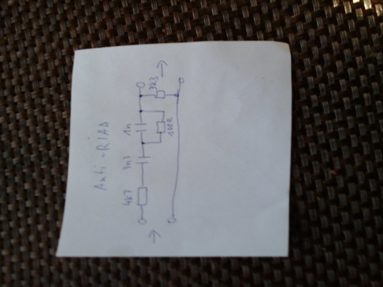 Zur Anregung habe ich hier noch eine Anti RIAA/DIN/BBC Schaltung, die wohl ursprünglich vom EMT 157 stammt und im Elektor Audio-Schaltungsbuch 1988, S. 9 dargestellt ist.