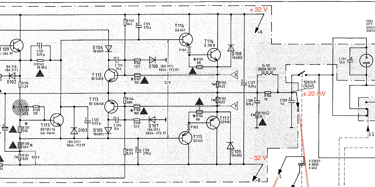 Liegt ein Ausgang auf +32 oder -32 Volt, ist vermutlich mindestens einer der Endstufentransistoren defekt (CE-Strecke Kurzschluß/Durchlegiert)