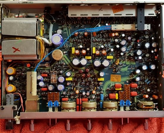Im Gegensatz zu der Grundig R-Serie habe ich keine weinroten Elkos im Kunststoffmantel gefunden. Diese würde ich immer alle tauschen (Schrott). Es gab 4 blaue Tantal im NF-Signal-Weg, die ich getauscht habe. Ich halte die Tantal Elkos zur Siebung der Spannungen für kritisch und habe schon viele abgerauchte Tantals gewechselt. Für NF Signale, als Koppelkondensatoren halte ich sie für nicht so kritisch. Außerdem meine ich, haben sie eine geringere Induktivität als vergleichbare Elkos. Viele wechseln ja alle Elkos persé. Dies kann man machen, wenn man das Gerät noch zukunftssicherer machen möchte. Wenn das Gerät aber einen Fehler hat, würde ich den Fehler zuvor suchen. Falls sich beim Wechsel aller Elkos unbemerkt ein Fehler einstellt, hat man zwei Fehler im Gerät und es wird um ein mehrfaches schwieriger, die Fehler zu lokalisieren. Bild 6 7. Finale