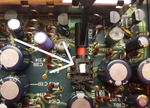 Bekannter Maßen laufen die versilberten Kontakte in den Schaltern über die Jahre schwarz an. Insbesondere dann, wenn sie nur wenig benutzt werden. Um festzustellen, wie es um die Schalter bestellt ist, lasse ich den Verstärker wieder „rauschen“ und klopfe mit einem Griff eines Schraubendrehers auf das Ausgangs-Relais, auf den Schiebeschalter und auf den Umschalter Phono MM oder MC. Sind Knackgeräusche im Kopfhörer zu hören, dann ist was faul. Das Ausgangs-Relais zeigte keine Mucken - und wenn, die Abdeckung lässt sich abknipsen und die Kontakte lassen sich reinigen. Der Schiebeschalter mit dem blauen Steuerband konnte ich erfolgreich mit Oszillin / Feinreiniger behandeln. Der Phono-Umschalter blieb wehrhaft knatschig und sehr klopfempfindlich. Es gelangt kein Oszillin von außen nach innen. Von der Platinenseite aus, habe ich deshalb unten die Klipse am Schalter weggefräst, ihn ausgelötet und ihn auseinandergebaut. Ja, das ist möglich, auch wenn man es nicht glaubt oder sieht. Er besteht aus zwei Kunststoffhäften in denen der Schaltschieber, die Feder und die Rastnase untergebracht sind. Es empfiehlt sich, beim Öffnen des Schalters ein helles Handtuch unter zu legen. So findet sich die Feder, die gerne und fröhlich wegspring sicher wieder. Die Innenkontakte lassen sich wie bekannt mit Papier/Tuch und Oszillin reinigen. Danach zusammenbauen und freuen. Lupenbrille und eine gute Feinmotorik sind sehr von Vorteil. Bild 5 Auf dem Bild sieht der Schalter etwas zerdötscht aus - ich habe etwas gebraucht, bis ich erkannte, wie er aufgeht. 6. Elkos