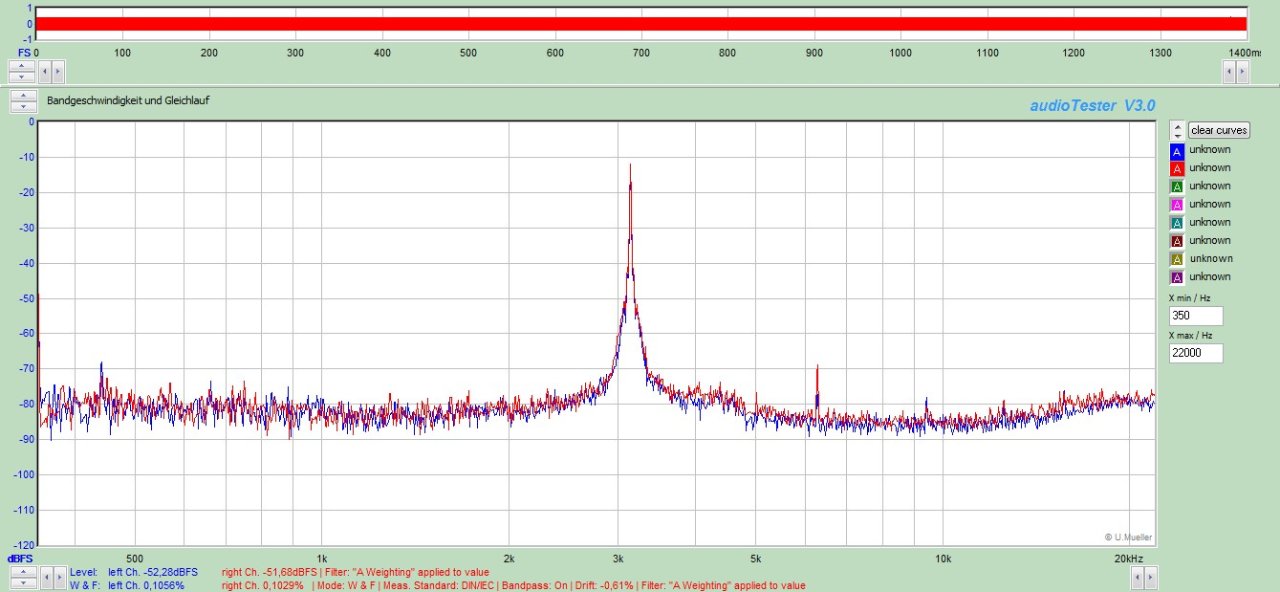 Die Bandgeschwindigkeit habe ich mit Absicht 0,5% zu langsam eingestellt. Wenn sich der neue Riemen weitet, wird die Geschwindigkeit nicht mehr weit weg vom Optimum sein. Der Gleichlauf beträgt 0,1% beim abspielen einer Meß/Fremdcassette