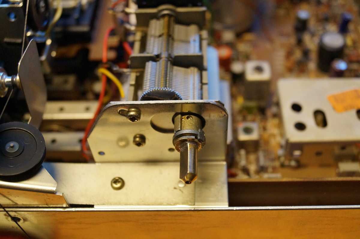 Nachdem das Tape und der Plattenspieler nun wieder einwandfrei laufen, macht der Receiver noch Probleme. Der Vorbesitzer sagte schon, dass der Skalenzeiger klemmt...zunächst dachte ich da fehlt einfach Schmierung. Dann stellte ich nach dem Zerlegen fest, dass ich hier das Problem habe, das viele Besitzer dieses Gerätes haben. Die Polyamid-Hülse aus der Achse, die den eigentlichen Drehko bewegt ist gerissen und blockiert. Außerdem ist das Zahnrad auf dieser Welle gebrochen (auch aus Polyamid).