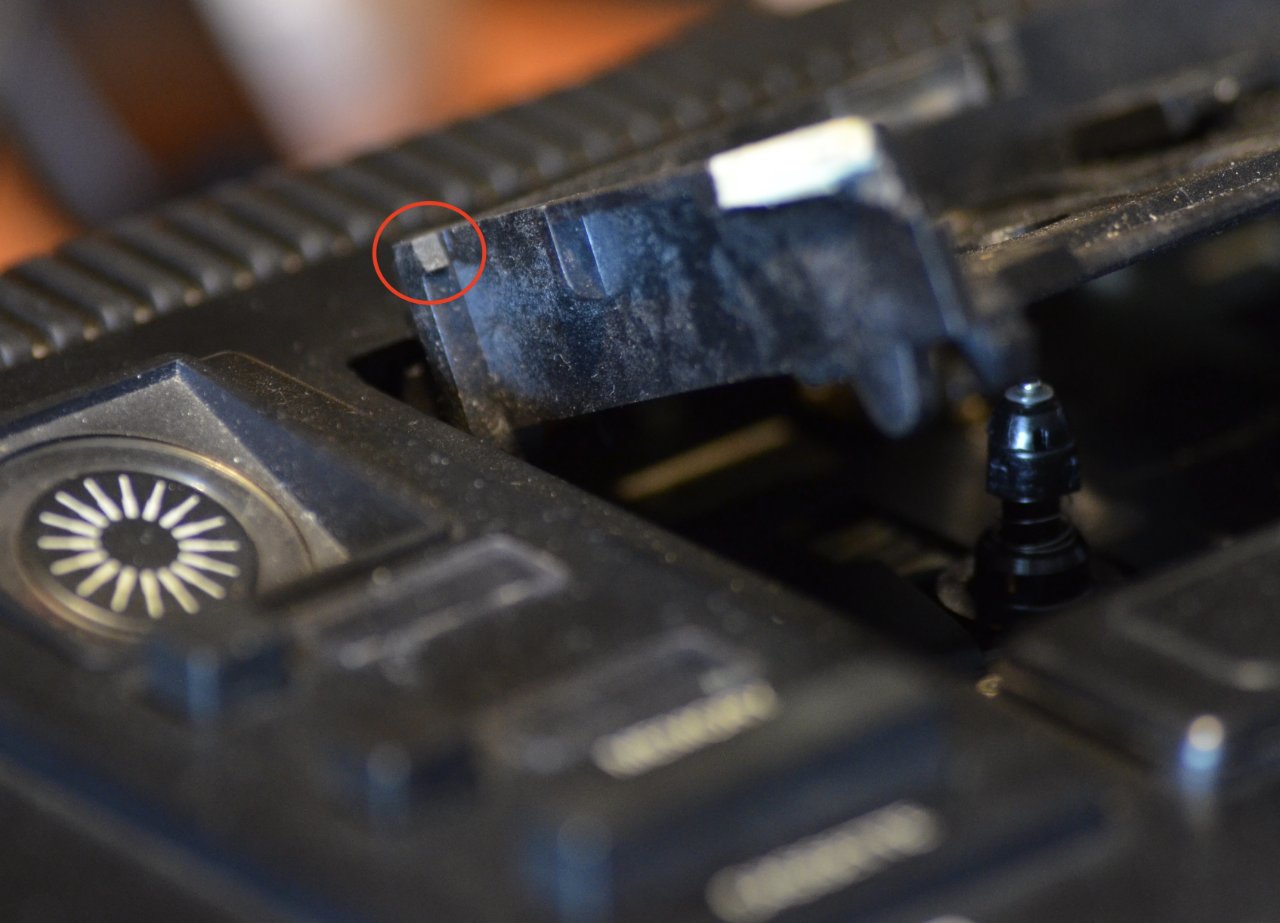 Ein vorderes Halteteil war auch bereits augebrochen, ist aber wohl vom Vorbesitzer repariert worden (der weiße Streifen vorne am Kassettenfach, etwas unscharf.