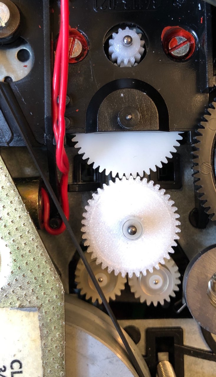 Auf dem Foto sieht man das neue TPU-Motorritzel sowie das TPU-Doppelzahnrad. Das halb verdeckte Zwischen-Zahnrad und die kleinen Wickeldornantriebszahnräder auf dem Schwenkhebel sind noch original, ebenso das Motorritzel für den Kopfschlittenantrieb. Zu Testzwecken hatte ich die Wickeldorn-ZR auch gegen TPU-Varianten getauscht, das brachte aber keine weitere Reduktion der Umspulgeräusche. Daher habe ich es dort bei den Originalen belassen.