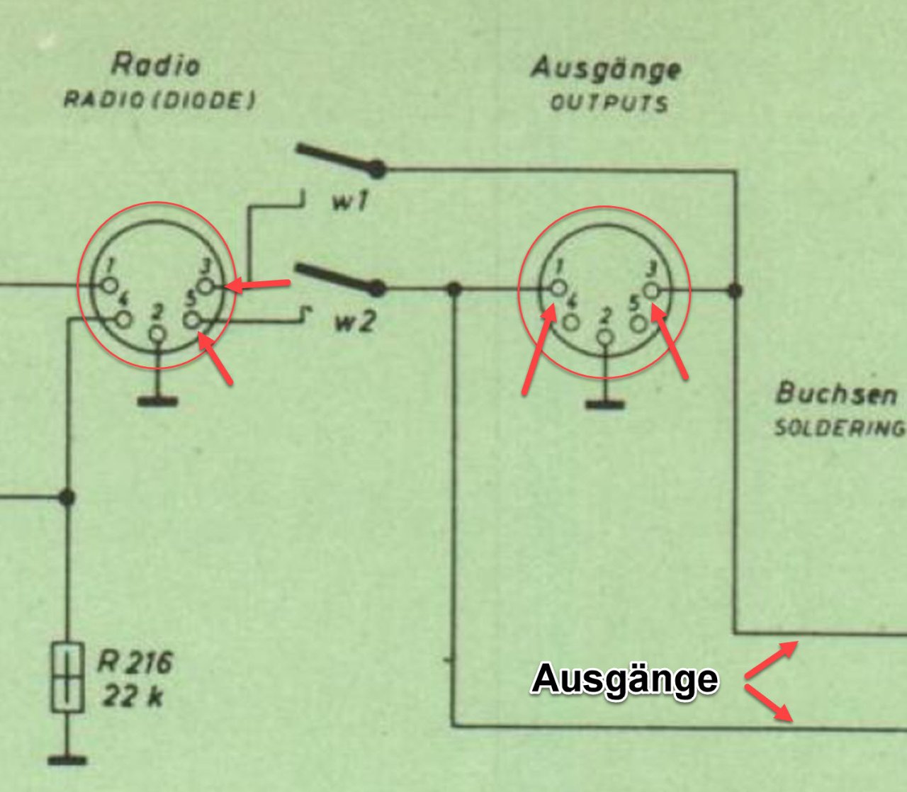 liegen die Ausgänge an der Buchse "Ausgang", zumindest heute nicht mehr üblich, an Pin 1 und 3.