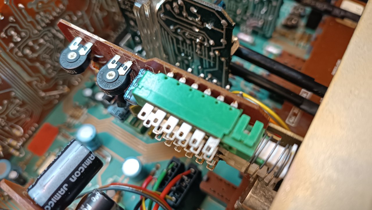 Schnell wurde klar, die Einmessvorrichtung ist völlig ohne Funktion. Wenn man die Einmeßtaster drückt, spielt weiter Musik anstelle der Einmeß Sinuse. Der Unterschied zwischen Vor und Hinterband war mehr als grausam. Die ersetzten Taster der Einmeßplatine haben einen riesen Betätigungsweg. Dieser stimmt nicht mit dem Eindrückweg welcher durch die Tasterköpfe möglich sind überein. Deshalb keine Funktion.