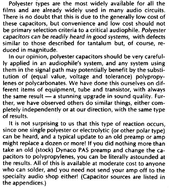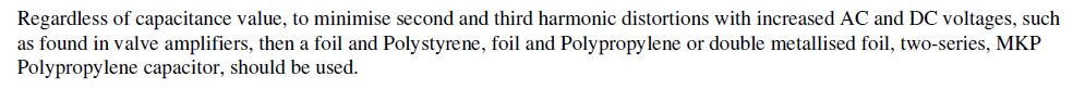 Dass Polyester/MKT-Filmkondensatoren keine Verzerrungen hinzufügen würden, ist also nicht richtig. In dem zitierten Artikel mangelt es an dem dafür notwendigen Testaufbau (Bias fehlt) der Variation der Testbedingungen (Intermodulationsverzerrungen sind auch zu messen), die Messung dort beschränkt sich ja nur auf THD. Polyester und MKT sind i.a. besser als Elkos, wenn die AC-Amplitude klein ist und der Bias nicht sehr hoch. Die Verzerrungen hängen davon ab, wieviel Bias ihnen auferlegt wird und auch wie hoch die beaufschlagte AC-Amplitude ist.
