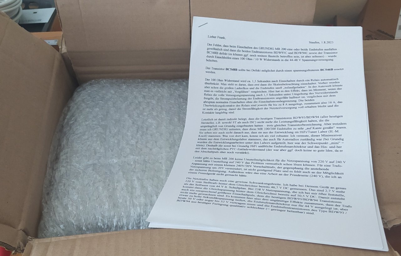 Der Rückbau mit den originalen eng tolerierten Grundig MKP-Folienkondensatoren hat sich gelohnt. Der Frequenzgang ist damit untadelig von 20 Hz bis 20 kHz, innerhalb +- 0,5 dB der RIAA Kennlinie. Der Phono-Klirrfaktor ist praktisch identisch zu dem über die Hochpegeleingänge. Der Phono-Vorverstärker ist gelungen, insbesondere auch aufgrund seines geringen Rauschens.