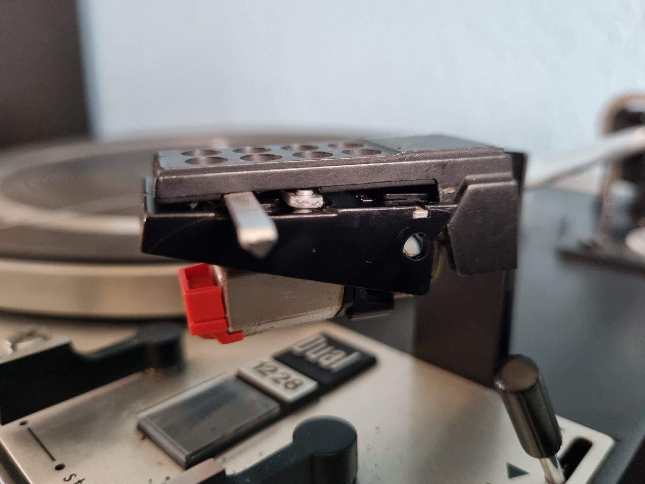Leider passt der von oben verschraubte AT-VM95E nicht in mein Dual Headshell bzw. wenn er in den Dual-Systemträger eingebaut ist passt der nicht mehr in das Headshell. Ein vermeintlich einfaches Projekt entpuppt sich als widerspenstig. Auch gut, hat man was zu tun.