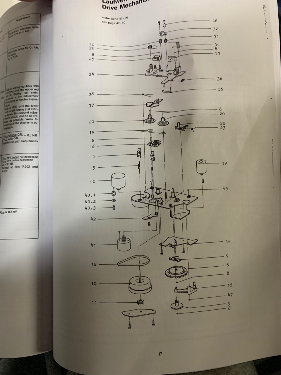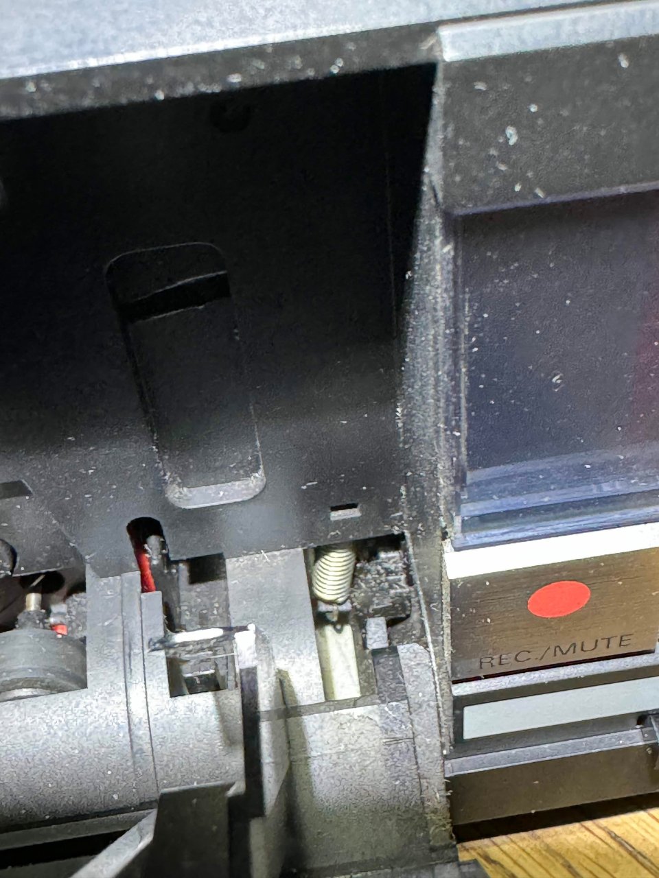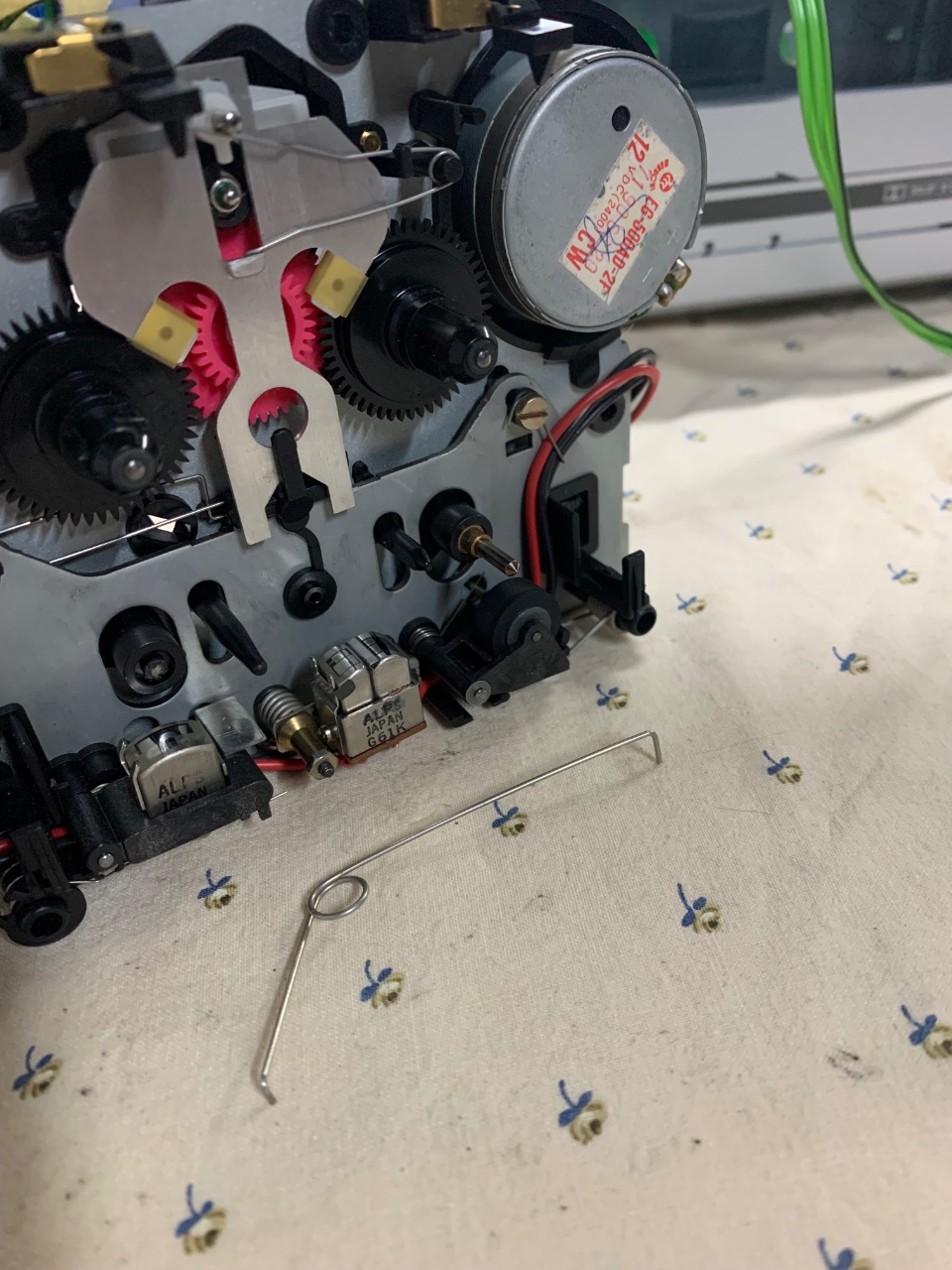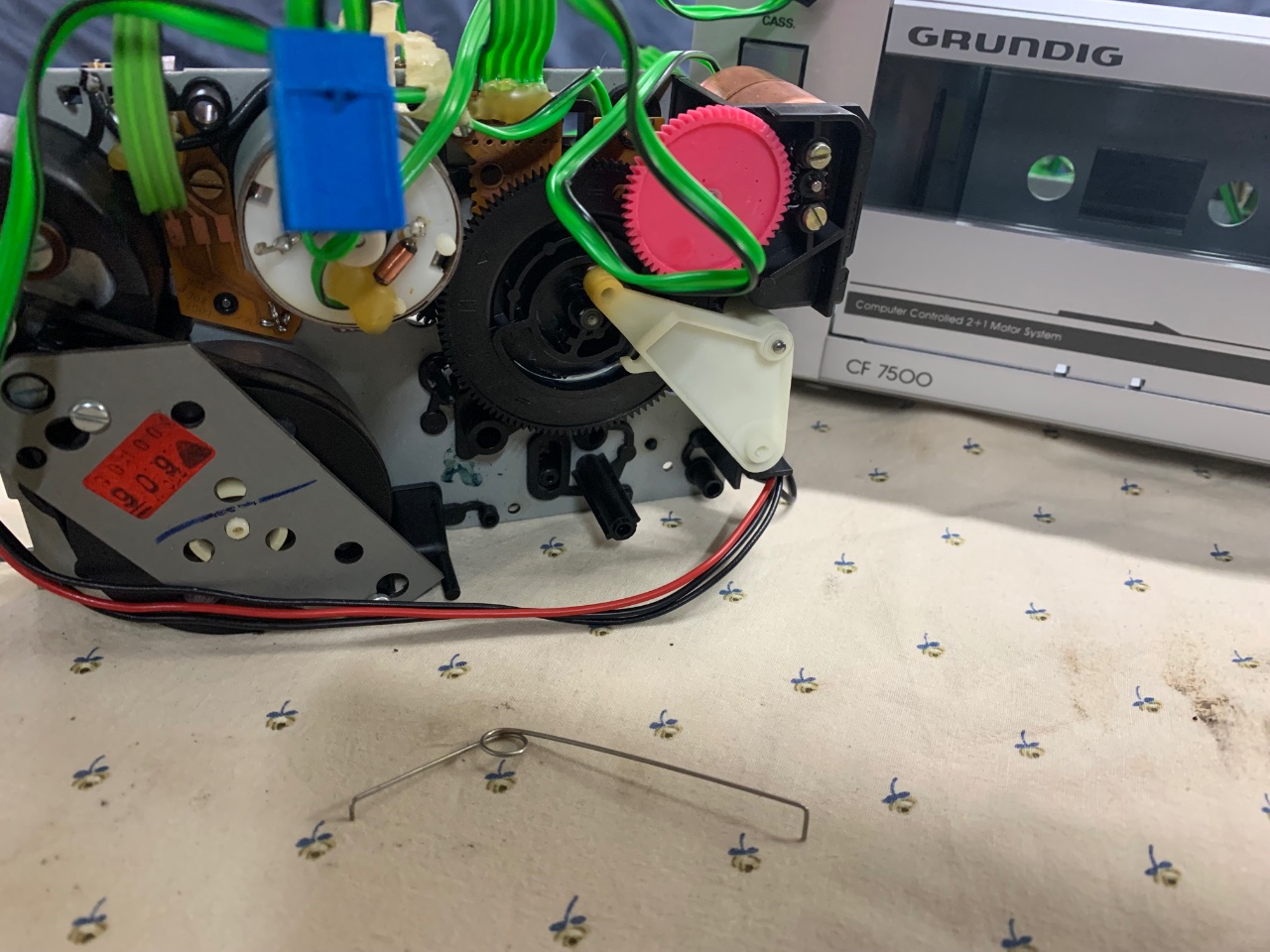 Rechts unten gibt es für die Cassettenklappe tatsächlich eine Zugfeder, die mit dem Öffnungsdämpfer verbunden ist. Die übrig gebliebene Feder sitzt m.E.n. unterm Laufwerk und stellt (vermutlich) eine Masseverbindung her, die es über die Plastikfront sonst nicht geben würde. Zumindest ist sie bei mir so verbaut. Im Servicemanual ist auch an Pos.48 eine Erdungsfeder genannt ...