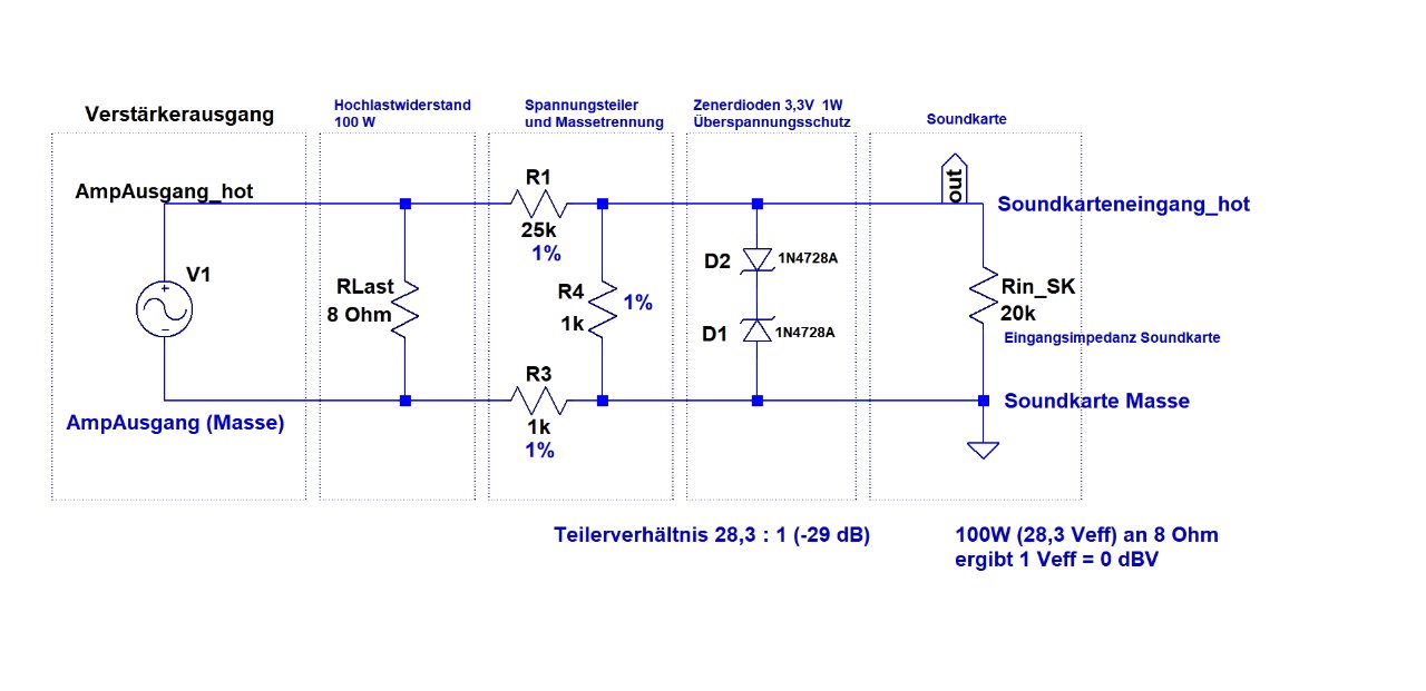 Der integrierte Spannungsteiler teilt die Ausgangsspannung am 4 Ohm- bzw. 8 Ohm Lastwiderstand am Lautsprecherausgang so herunter, dass bei 100 W an 8 Ohm (= 28,3 Veff) an der Soundkarte 1,0 Veff = 0 dBV anliegen, bzw. bei einem 4 Ohm Lastwiderstand bei 100 W 0,707 V = -3 dBV.