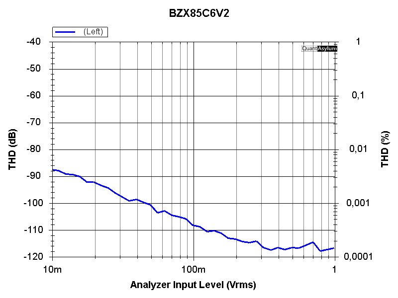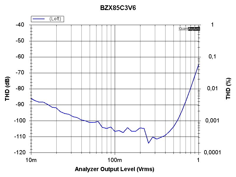 Selbst mit den ursprünglich verwendeten 3,9 V (C3V9PH) Zenerdioden erreicht der THD bei 1 V "nur" 0,01 % (in der Spannungsteilerschaltung entspricht 1 V ca. 100 W am 8 Ohm Lastwiderstand).