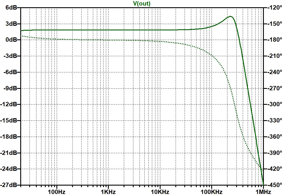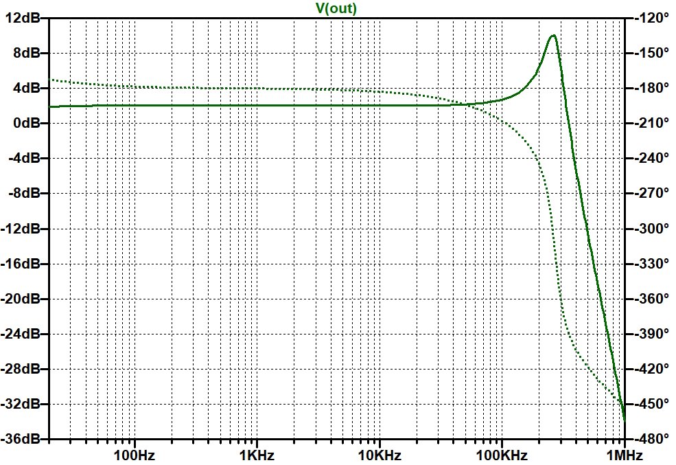 Kritisch wird es erst, wenn C2 ausfällt. Damit ist bereits das Schwing-Kriterium erfüllt, dass die Phasenreserve der offenen Schleifenverstärkung bei ca. 260-300 kHz nicht mehr ausreicht und die Verstärkung dabei >> 1 ist.