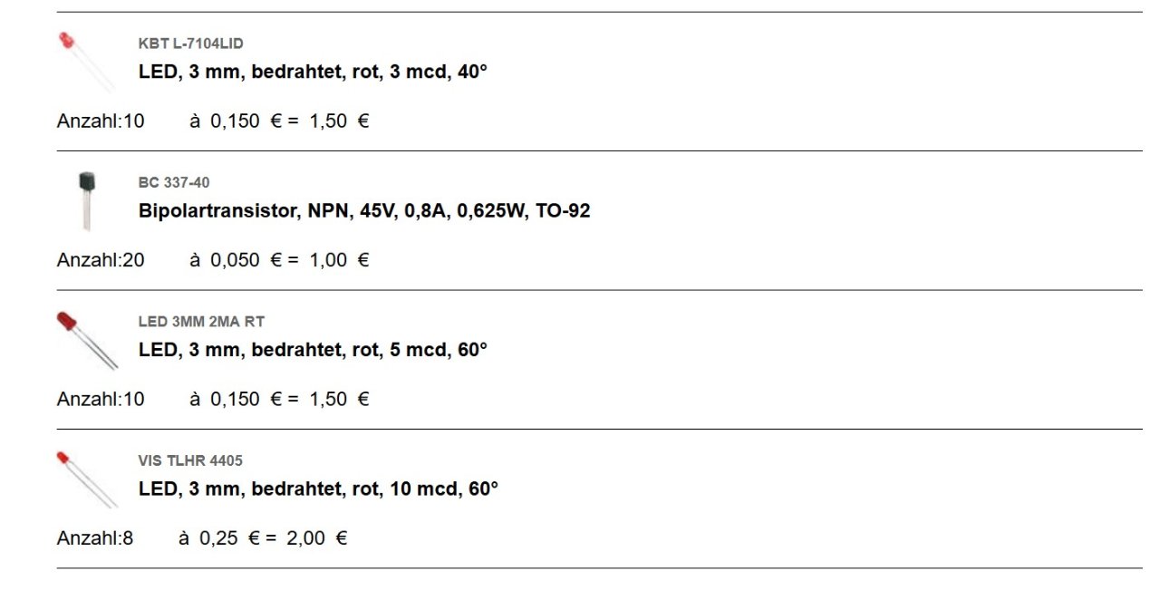 Nach längerer "Bestellpause" habe ich gerade (zusammen mit Teilen für andere Baustellen) ein kleines Sortiment roter LED mit 3, 5 und 10 mcd beim großen R bestellt.