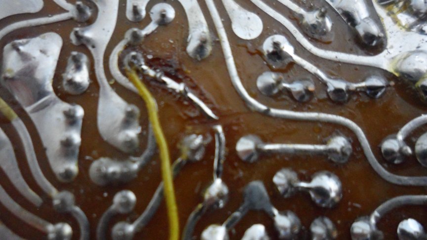 So fehlt z.B eine lt. Plan und Platinendruck vorgesehene feste Drahtbrücke auf der Platinenbestüclungsseite (von Punkt 7 des Quellenwahlschalters zu R609) und ist stattdessen durch eine flexible Drahtverbindung auf der Lötseite ersetzt, allerdings direkt zum Kontakt 7 des Schalters. Weitere lt. Plan vorgesehene "extra Lötpunkte" für Drahtverbindungen sind nicht vorhanden, die Drähte stattdessen an Bauteile-Lötpunkte unmittelbar angelötet.