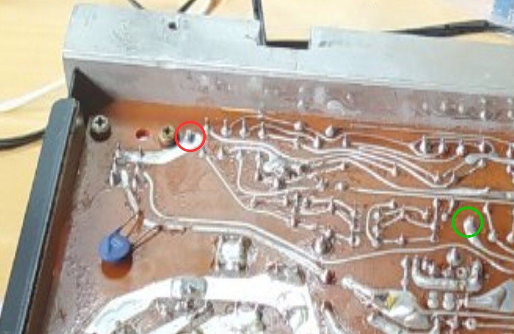 Diese Masseverbindung geht über das Kühlblech für den Stabi-Transistor T839. Der Lötkontakt zum Kühlblech im roten Kreis war gebrochen. Der zweite erforderliche Masse-Kontakt des Kühlblechs ist mit grünem Kreis markiert und sollte auch überprüft werden: